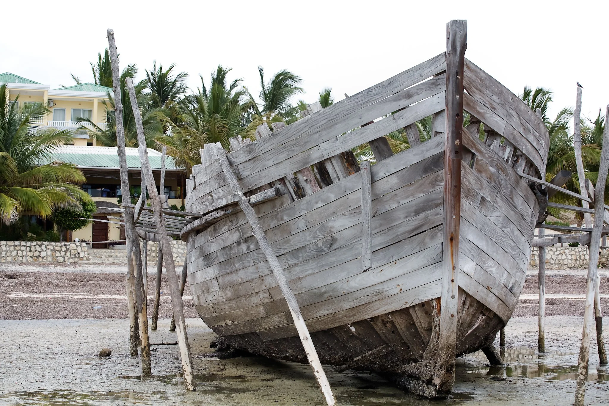 From the dunes above the beach, the archipelago lies marooned in shallow water. Dhows sit stranded on sandbanks, their keels exposed. The sea has retreated, leaving behind pools of oily water trapped by the tide, stained by the exhaust of ageing outboard motors. Great piles of dead sea grass line the high-water mark.