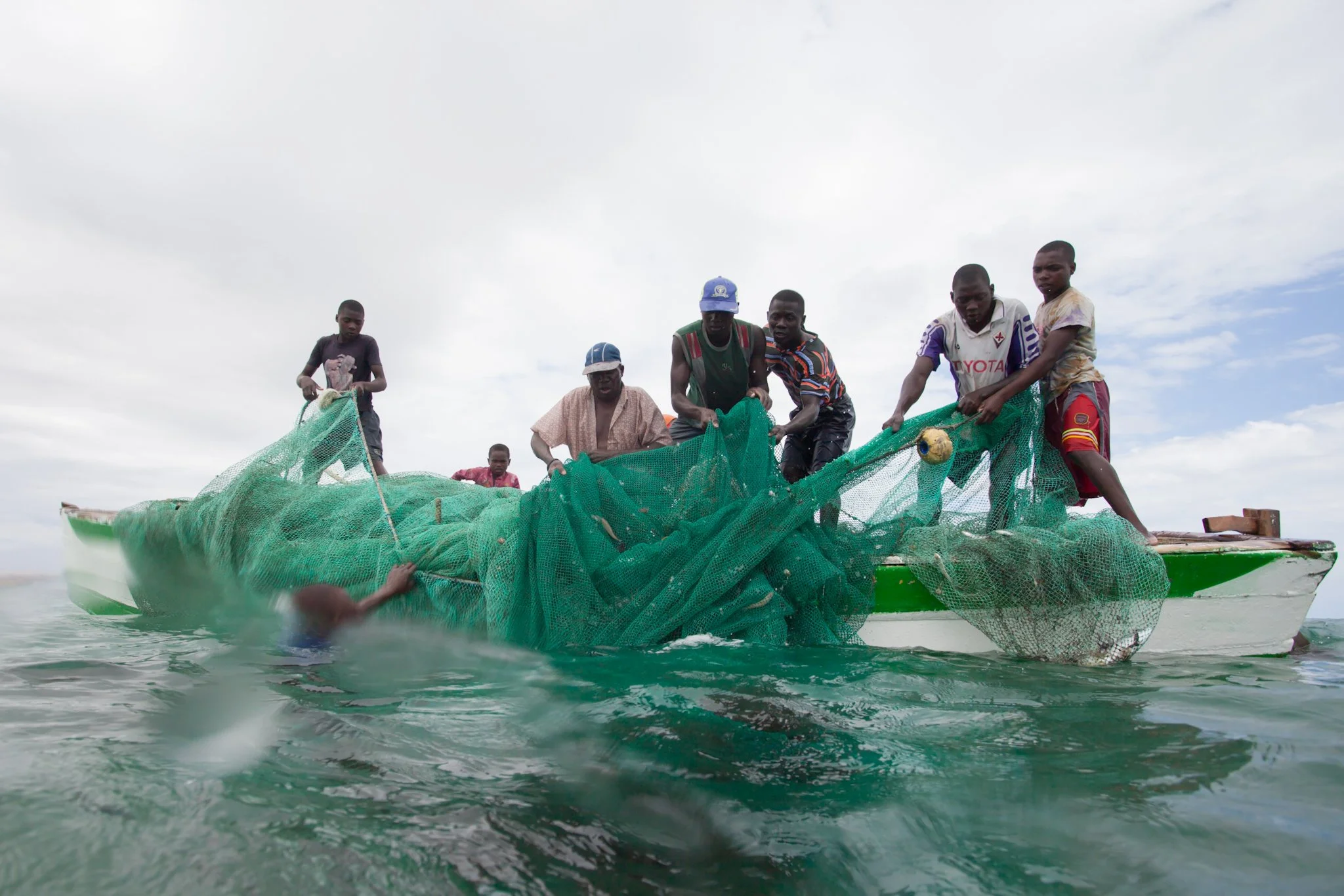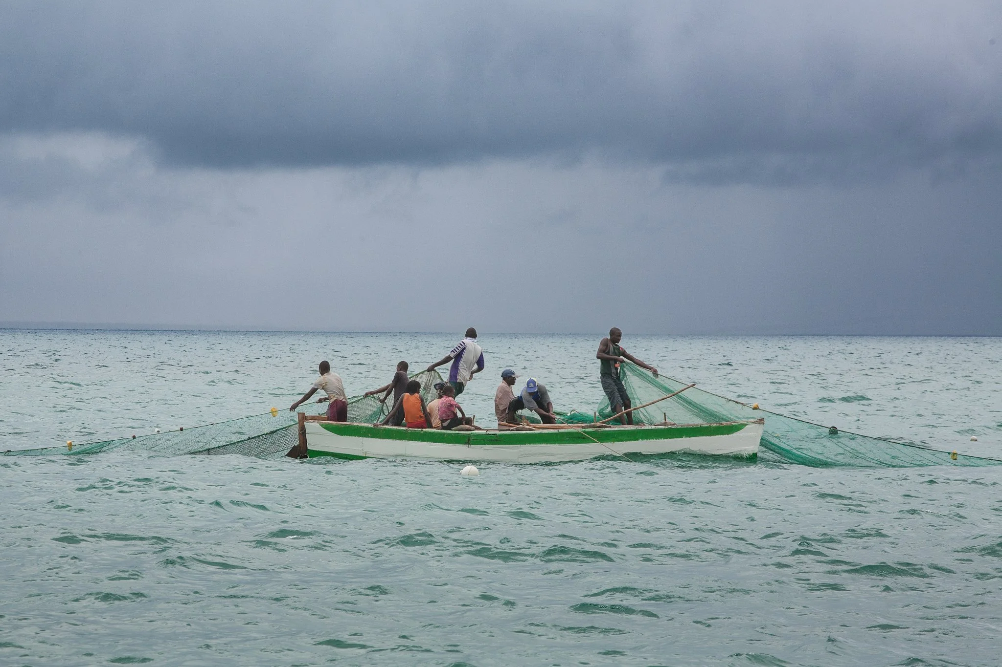 Out in the archipelago’s lagoon, several kilometres from shore, two families work a net together. Two dhows float nearby, each crowded with women, men, and children. More people stand in the water on a low-tide sandbank, hauling in a net that stretches across the shallows.
