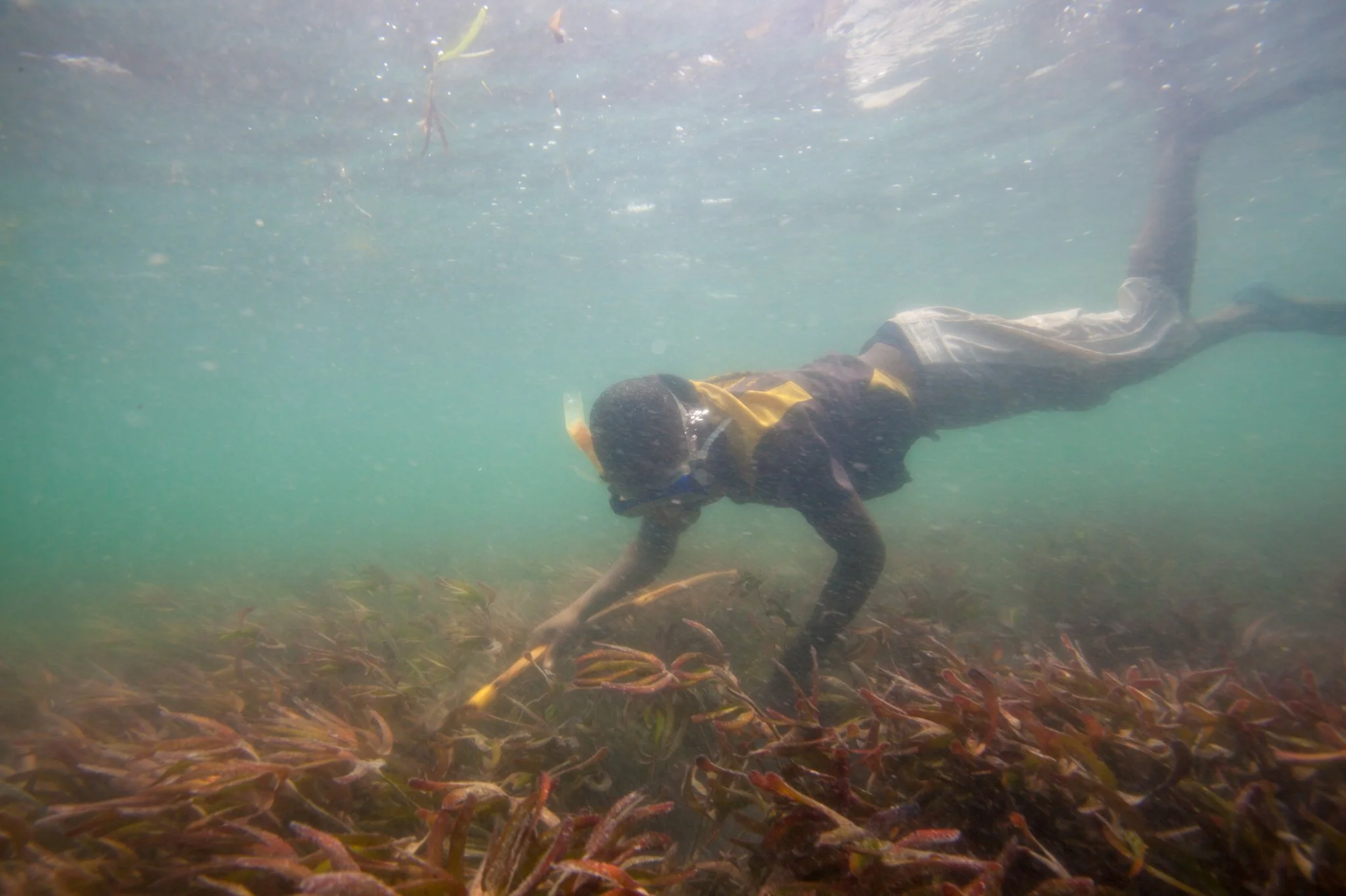 It is a collective effort. Initially, a dozen people pull steadily on the net. As it draws closer, everyone joins in. The net drags across the seabed, bumping and snagging, mowing the sea grass down to short stubble and trapping everything in its path.